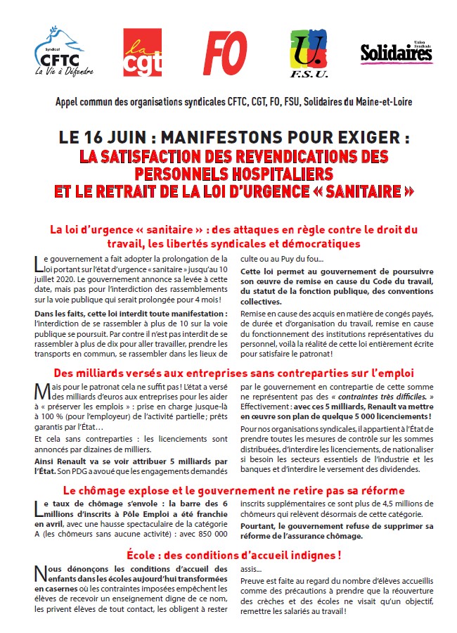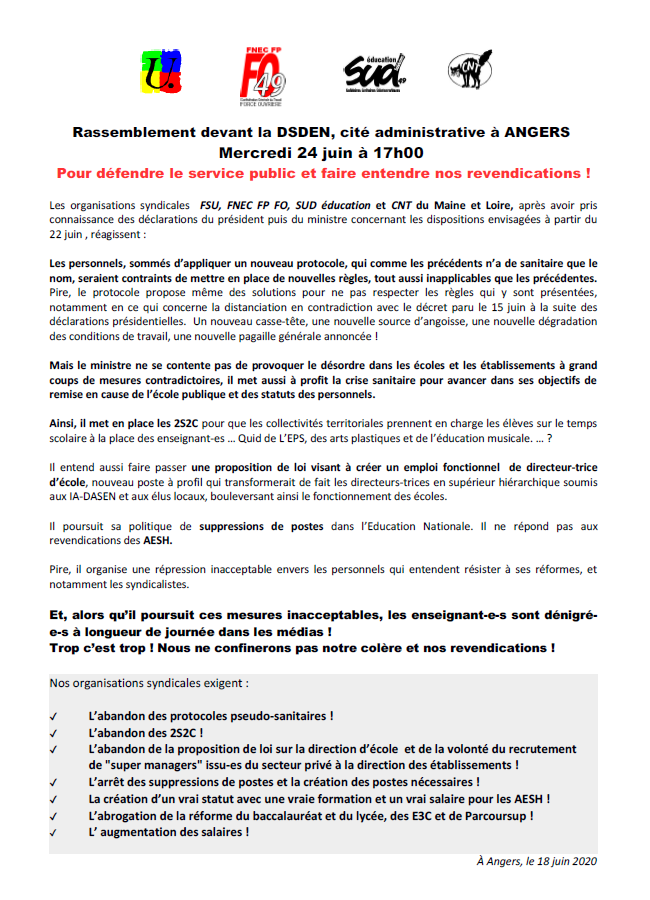 Les organisations syndicales FSU, FNEC FP FO, SUD éducation et CNT du Maine et Loire, après avoir pris connaissance des déclarations du président puis du ministre concernant les dispositions envisagées à partir du 22 juin , réagissent : la suite c’est là :