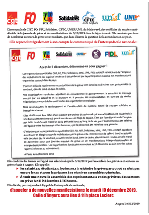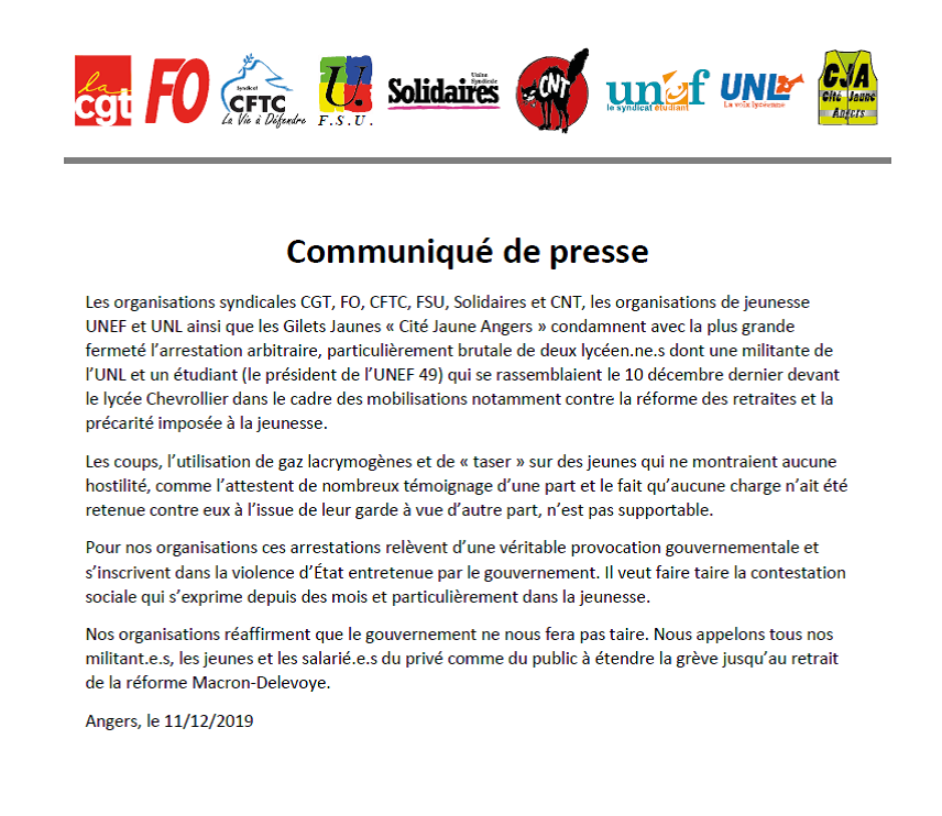 Les organisations syndicales CGT, FO, CFTC, FSU, Solidaires et CNT, les organisations de jeunesse UNEF et UNL ainsi que les Gilets Jaunes « Cité Jaune Angers » condamnent avec la plus grande fermeté l’arrestation arbitraire, particulièrement brutale de deux lycéen.ne.s dont une militante de l’UNL et un étudiant (le président de l’UNEF 49) qui se rassemblaient le 10 décembre dernier devant le lycée Chevrollier dans le cadre des mobilisations notamment contre la réforme des retraites et la précarité imposée à la jeunesse.