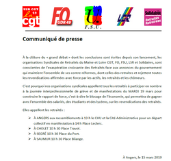 C’est pourquoi nos organisations syndicales appellent tous les retraités à participer en nombre à la journée interprofessionnelle de grève et de manifestations du MARDI 19 mars pour construire le rapport de force, c’est-à-dire le blocage de l’économie, qui permettra de gagner avec l’ensemble des salariés, des étudiants et des lycéens, sur les revendications des retraités.